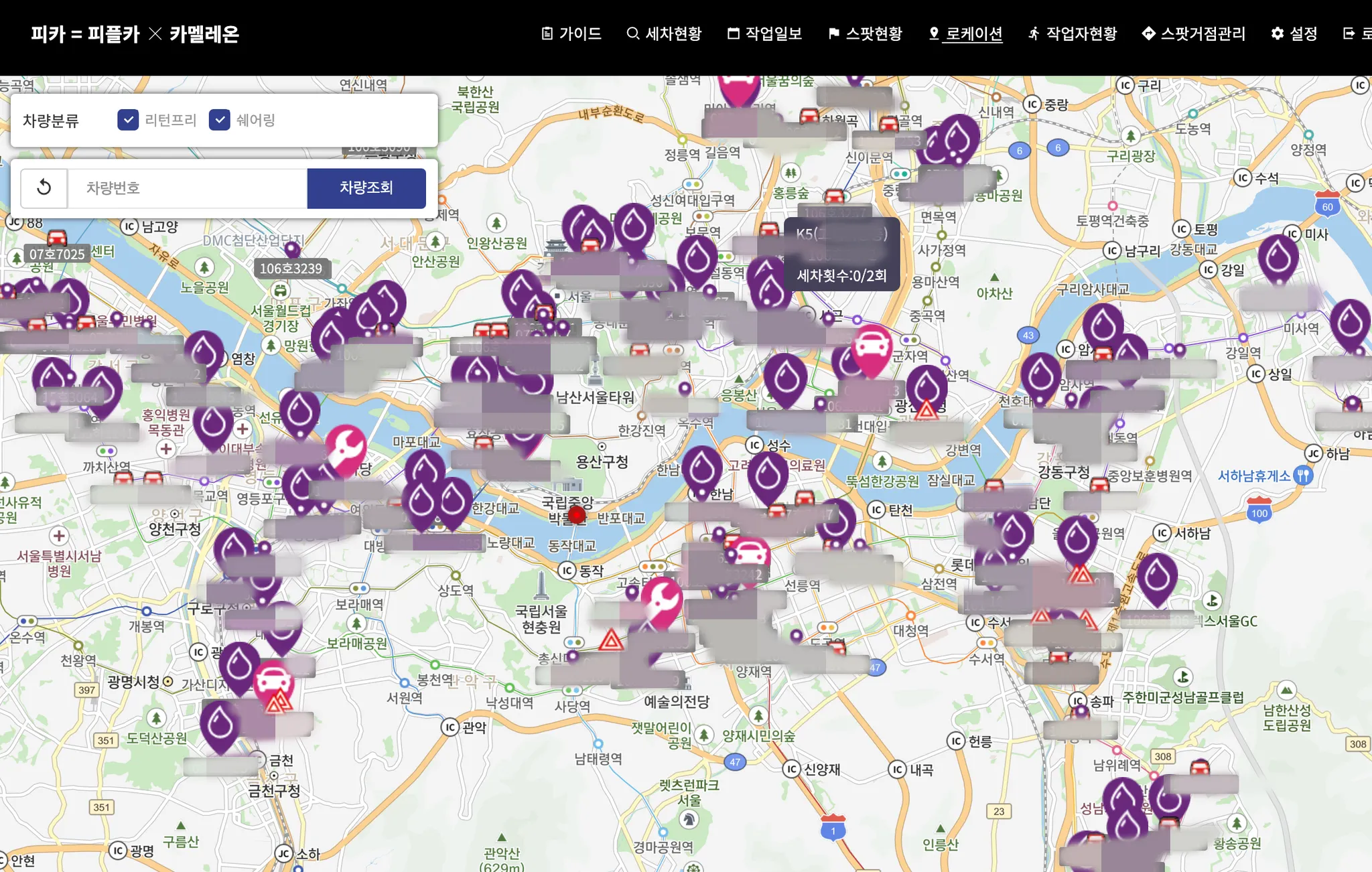 피플카는 쏘카, 그린카 다음으로 가장 많은 차량과 대여스팟을 보유하여 카쉐어링 서비스를 제공하는 기업입니다. 대부분의 쉐어링업체들은 차량을 대여시 최초대여장소에서 다시 찾아와 반납해야하지만, 피플카의 경우 지정된 다른 주차장소에서도 반납이 가능한 리턴프리 서비스를 베타로 진행하고 있습니다. 대여된 차량이 다른 주소지에 반납될 경우, 일정시간이후 반드시 차량이 본래 차고지로 복귀해야하는 행정적, 법률적 문제로 인해 기존 일반적인 카쉐어링 시스템과 별개의 시스템으로 관리되고 있는 상황이었습니다.