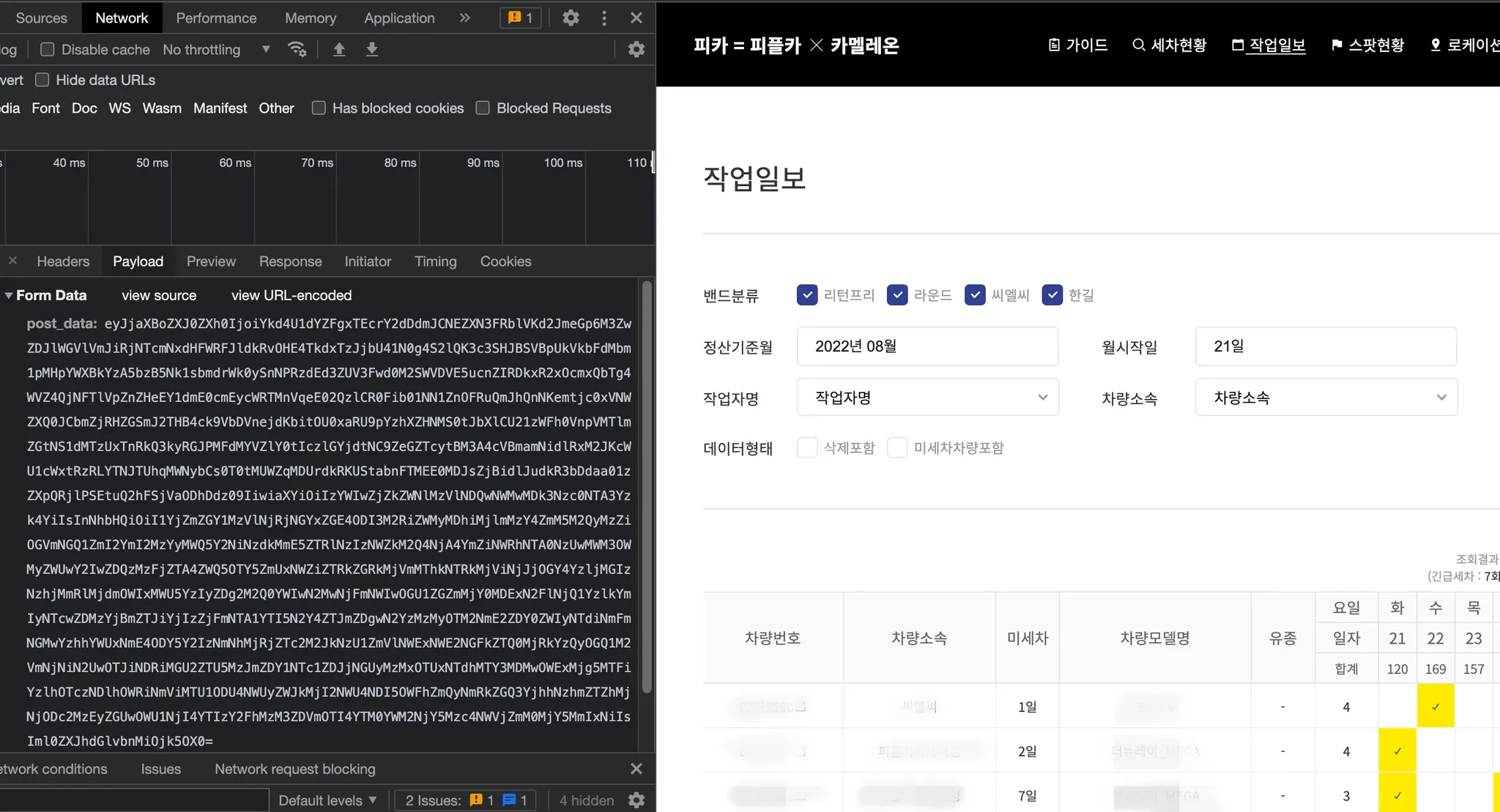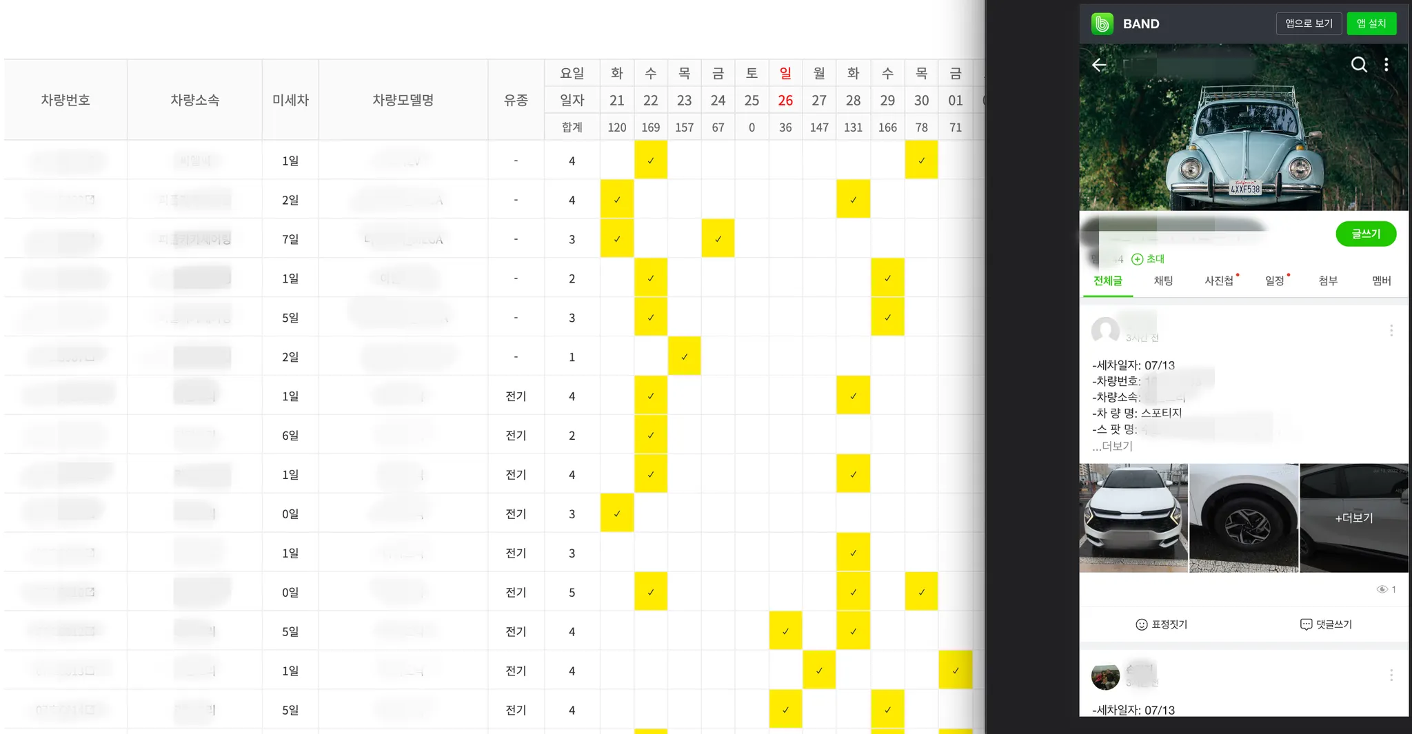 카쉐어링 서비스를 운영하기 위해서는 차량의 정비, 주기적인 세차, 본래 차고지로의 탁송등 다양한 업무가 필요했지만, 기존의 카쉐어링 시스템과 리턴프리 시스템이 분할되어 운영되고 있어 서비스 운영에 많은 차질이 있었으며, 특히 이러한 서비스를 제공하는 협력업체들의 데이터를 네이버밴드를 통해 업체별로 수집하고 있는 상황이었습니다.