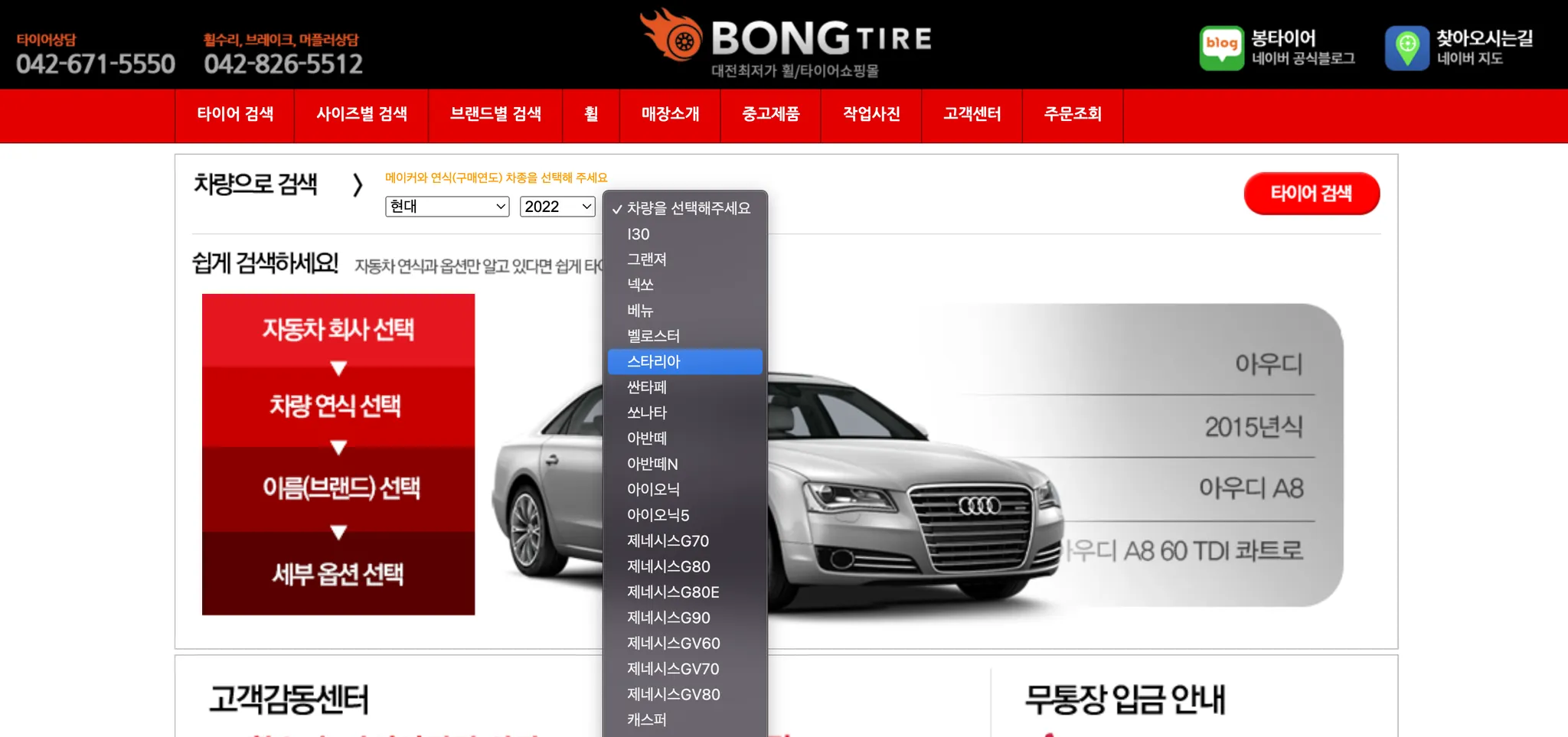 자동차정비사를 개인적으로 취득할 정도로 자동차에 관심이 많았고, 잠시동안 함께 일했던 타이어매장 사장님의 요청으로 쇼핑몰과 온라인판매를 위한 돌파구 및 솔루션을 요청해왔습니다. 대부분의 공산품을 판매하는 쇼핑몰들은 공산품의 제품들이 어느정도 규격화 되어 있는 반면, 타이어제품의 경우 하나의 타이어패턴마다 수백개~수천개의 사이즈가 존재하기 때문에 일반적인 쇼핑몰로는 상품관리에 대한 대응이 불가능한 상황이었습니다. 무엇보다 타이어교환 고객들의 대다수는 자신의 차량에 대한 타이어 사이즈를 모르는 경우가 많았고, 일반인도 손쉽게 타이어 사이즈로 검색할 수 있는 자체적인 검색엔진을 개발하였습니다. 제조사 → 연식 → 차량모델 → 옵션 선택을 통해 고객차량에 대한 타이어 사이즈를 검색함으로써 성공적인 온라인 전환이 가능하였습니다.