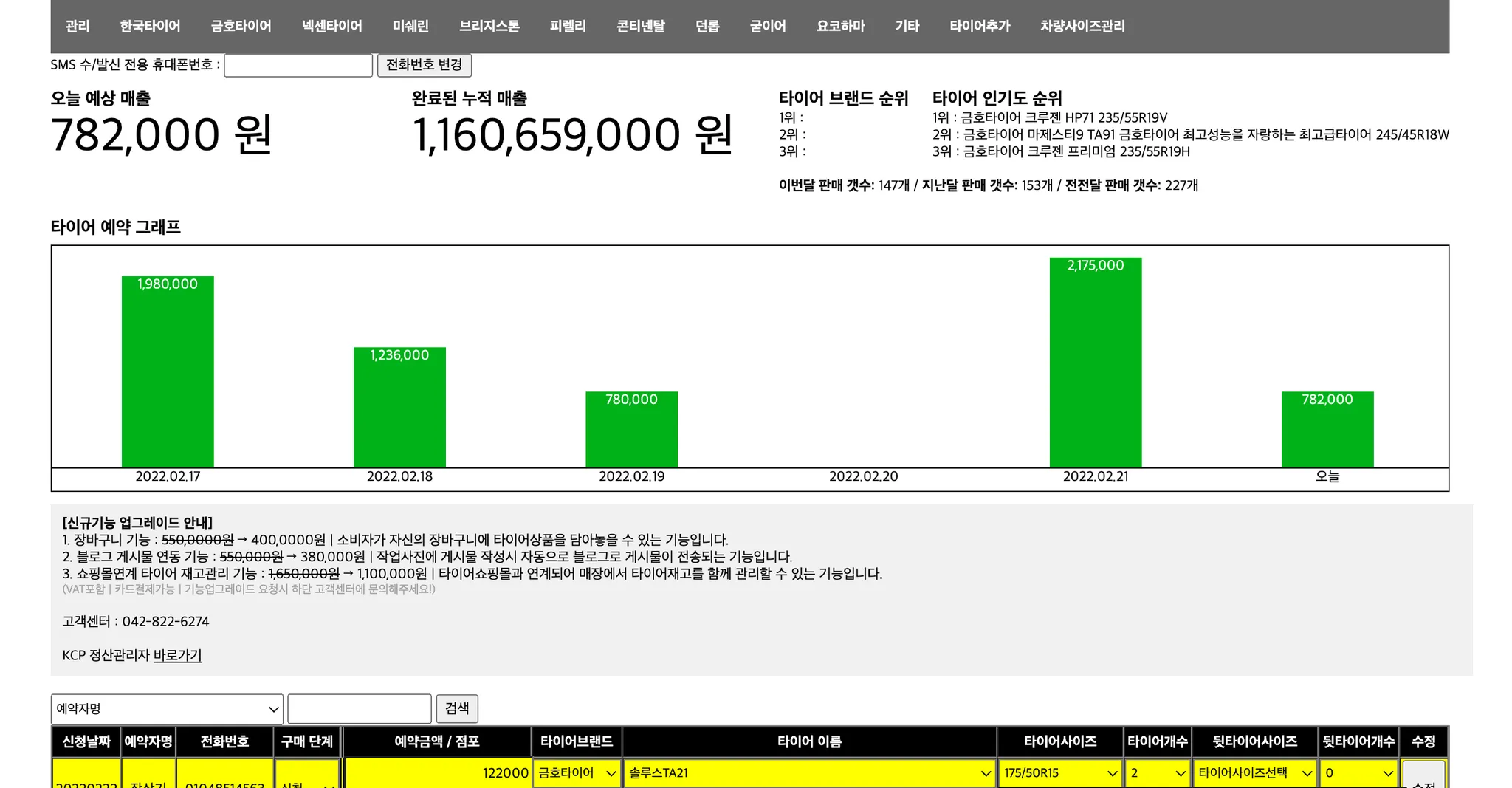 타이어제품마다 수백~수천개에 달하는 사이즈와 사이즈마다 천차만별로 바뀌는 가격정보에 대응하기 위해 공장도가 * 판매가율로 일괄 가격 설정이 가능한 관리자기능을 개발하였으며, 이러한 기능을 통해 전체 수십만종의 제품가격을 5분안에 수정할 수 있도록 하였습니다. 고객이 쇼핑몰에서 미리 선결제할 수 있도록 PG연동과 함께 고객의 예약정보와 작업에 대한 세부적인 내용을 누적으로 기록할 수 있는 장부기능을 개발하였고, 2015년도 당시에는 타이어를 온라인으로 구매할 수 있는 마땅한 대안이나 경쟁업체가 없었기 때문에 해당 업체는 승승장구하였고 한 개 매장단독 연 15억원 이상의 매출을 올리는 매장으로 발돋움하게 되었습니다.